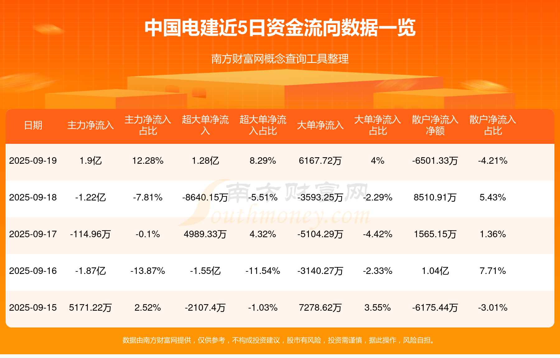 9月19日消息,中国电建资金净流入1.9亿元,超大单净流入1.28亿元,换手率2.07%,成交金额15.43亿元。