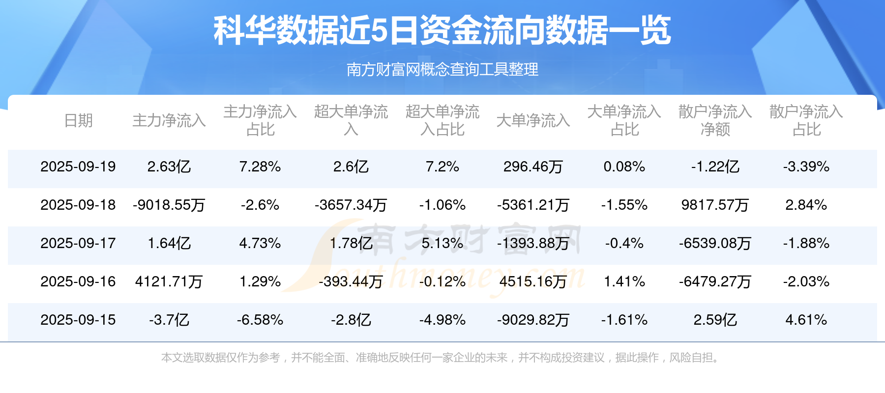 9月19日消息,科华数据9月19日主力净流入2.63亿元,超大单净流入2.6亿元,大单净流入296.46万元,散户净流出1.22亿元。