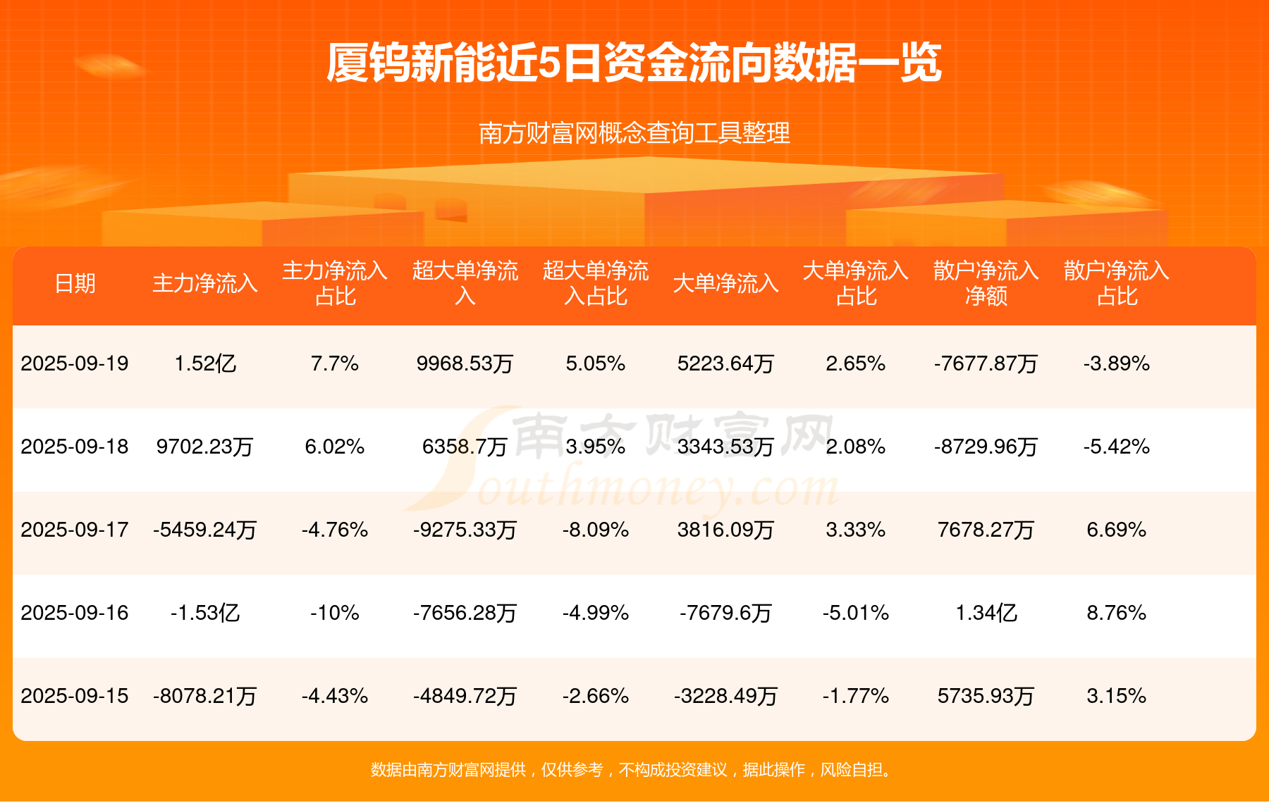 9月19日消息,厦钨新能主力净流入1.52亿元,超大单净流入9968.53万元,散户净流出7677.87万元。