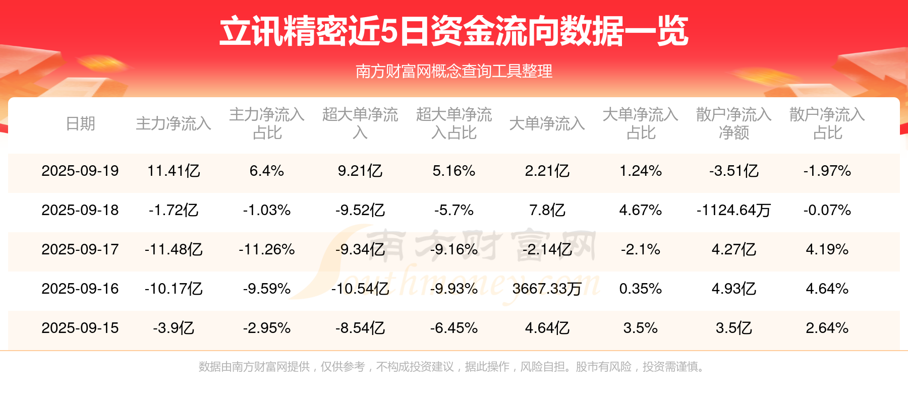9月19日消息,立讯精密9月19日主力净流入11.41亿元,超大单净流入9.21亿元,大单净流入2.21亿元,散户净流出3.51亿元。