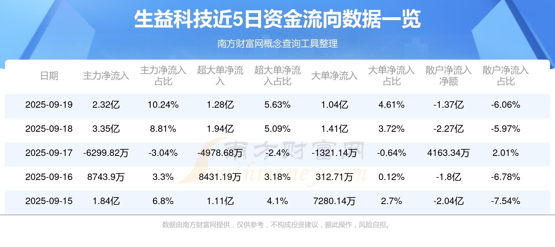 9月19日消息,生益科技9月19日主力资金净流入2.32亿元,超大单资金净流入1.28亿元,大单资金净流入1.04亿元,散户资金净流出1.37亿元。