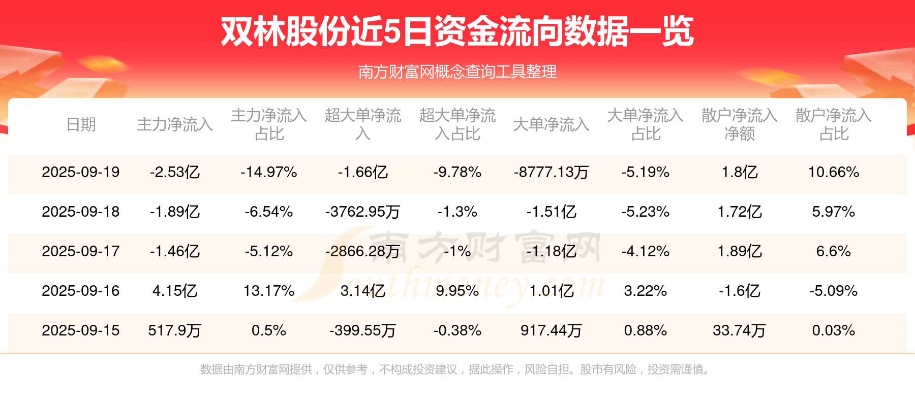 根据数据显示,双林股份股票在9月19日15时收盘跌5.32%,报价为45.420元。当日成交额达到16.92亿元,换手率6.63%,总市值为259.79亿元。