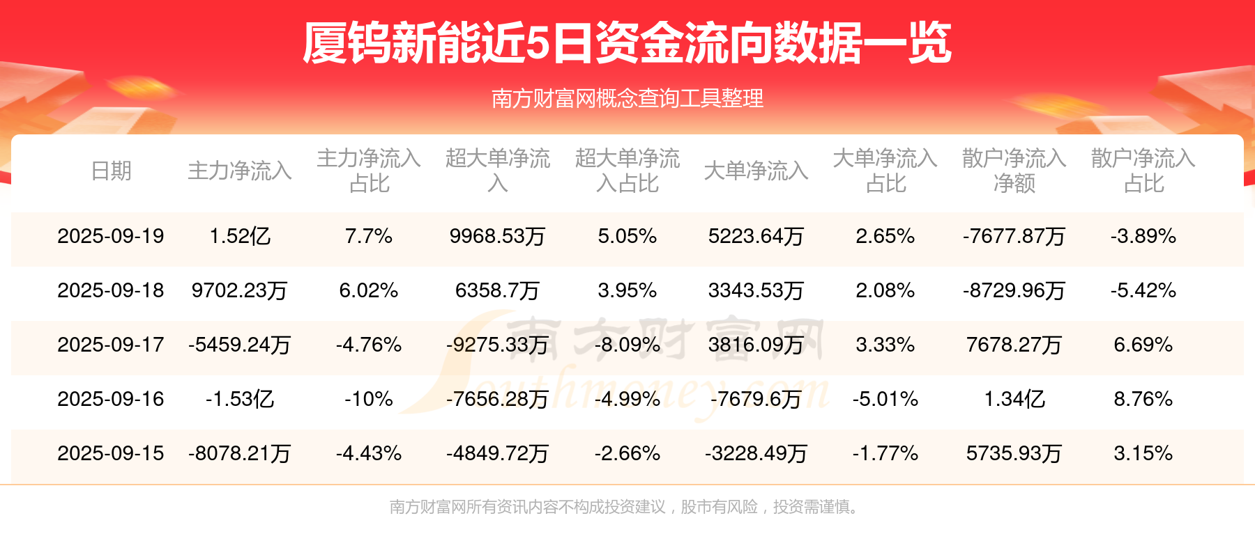 9月19日消息,厦钨新能主力净流入1.52亿元,超大单净流入9968.53万元,散户净流出7677.87万元。