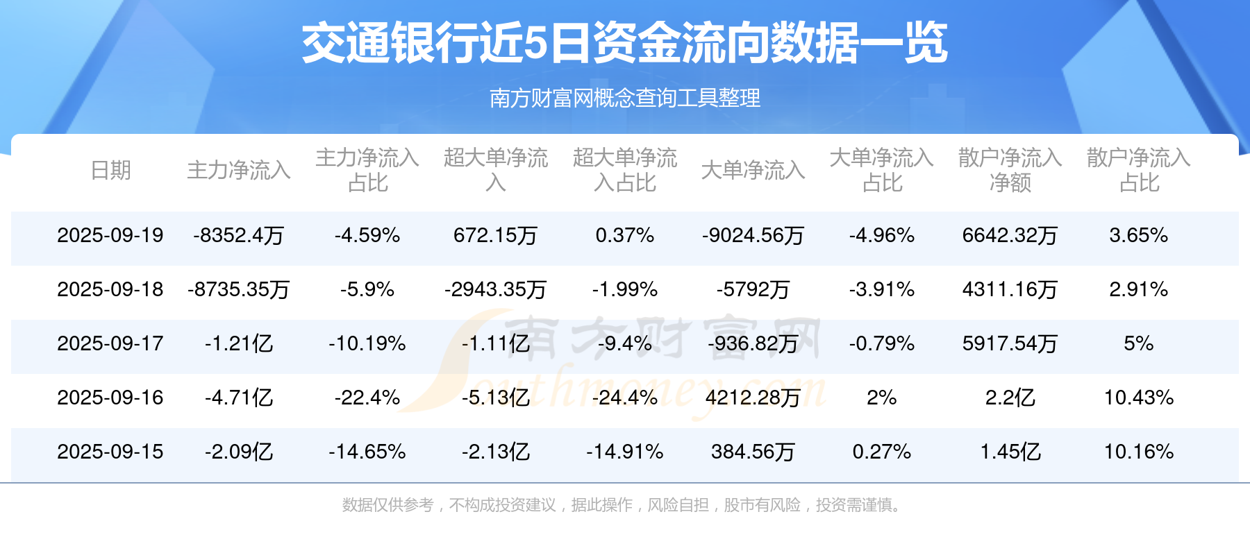 9月19日消息,交通银行资金净流出8352.4万元,超大单资金净流入672.15万元,换手率1.01%,成交金额18.18亿元。