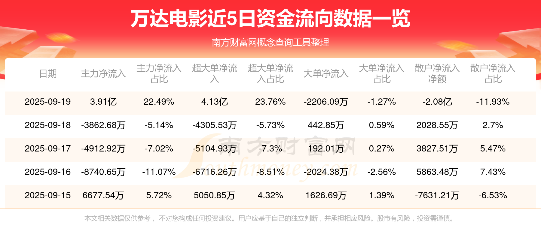 9月19日消息,万达电影9月19日主力净流入3.91亿元,超大单净流入4.13亿元,大单净流出2206.09万元,散户净流出2.08亿元。