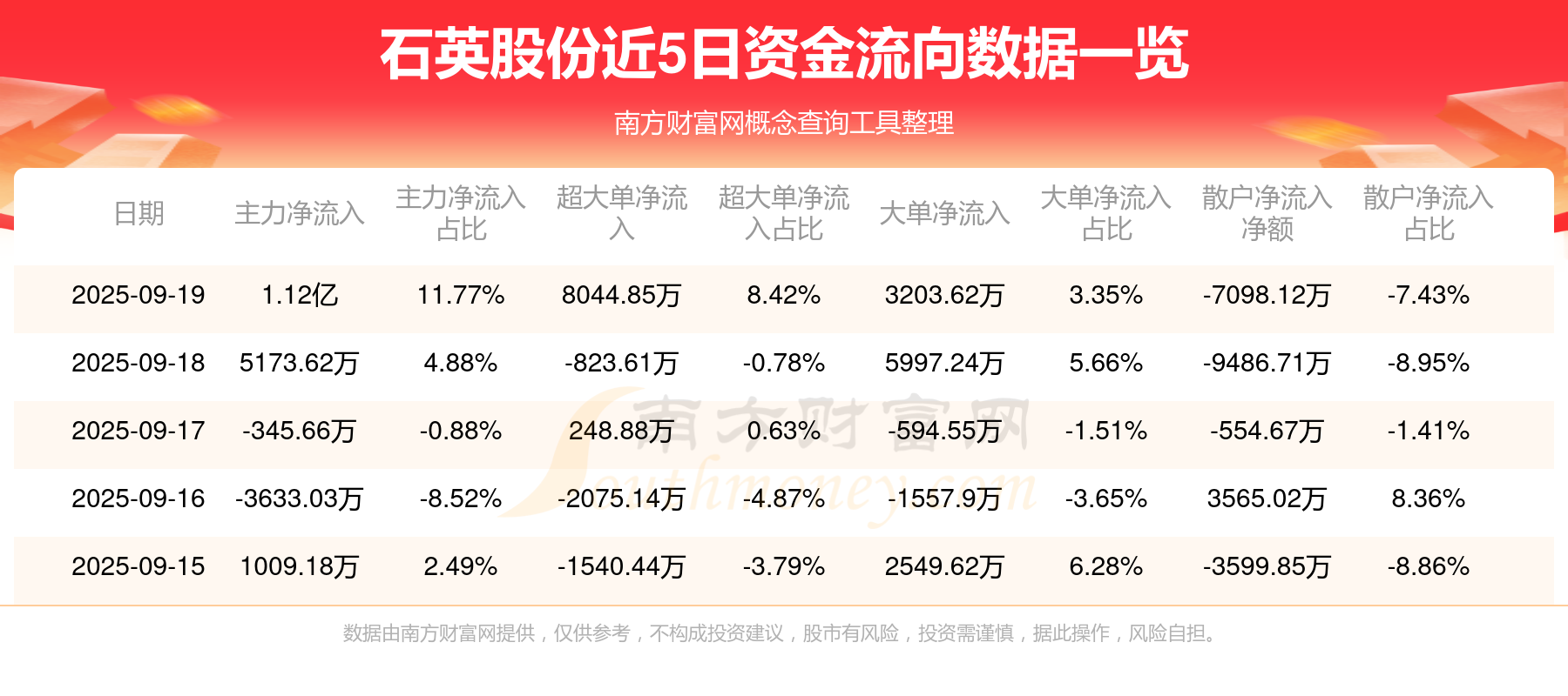 9月19日消息,石英股份9月19日主力资金净流入1.12亿元,超大单资金净流入8044.85万元,大单资金净流入3203.62万元,散户资金净流出7098.12万元。