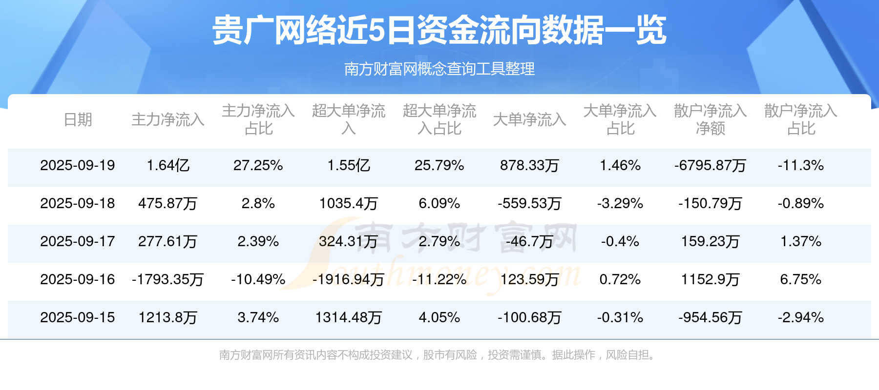 9月19日消息,贵广网络主力资金净流入1.64亿元,超大单资金净流入1.55亿元,散户资金净流出6795.87万元。