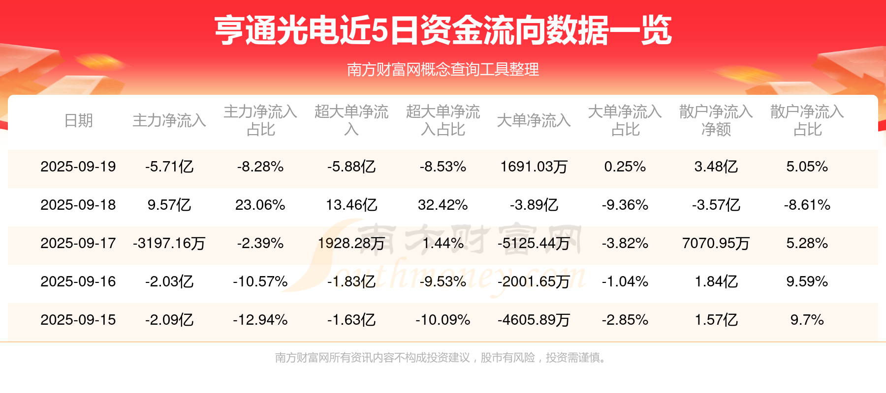9月19日消息,亨通光电9月19日主力资金净流出5.71亿元,超大单资金净流出5.88亿元,大单资金净流入1691.03万元,散户资金净流入3.48亿元。