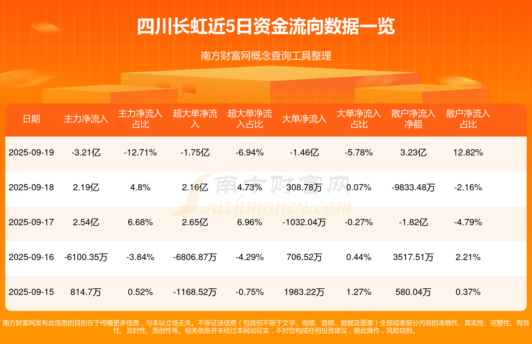 9月19日消息,四川长虹9月19日主力资金净流出3.21亿元,超大单资金净流出1.75亿元,大单资金净流出1.46亿元,散户资金净流入3.23亿元。