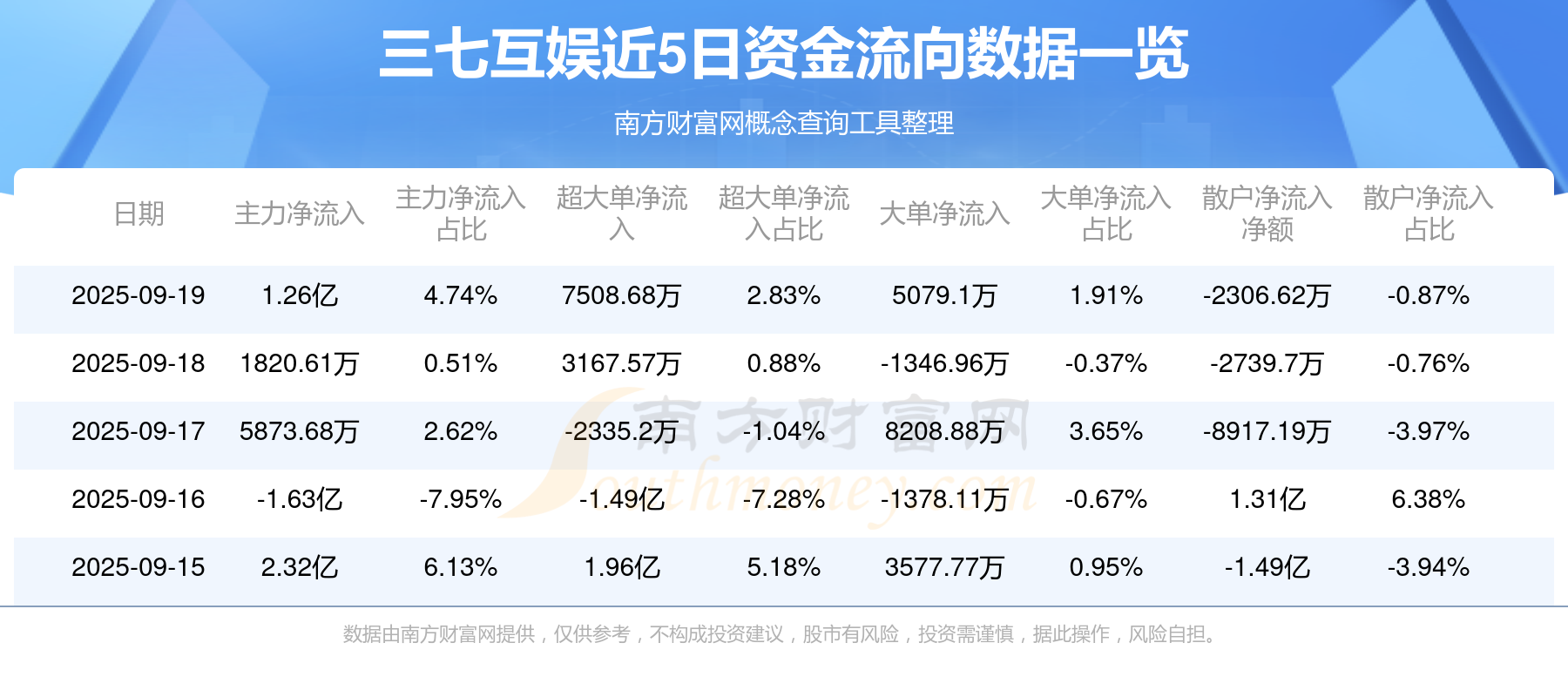9月19日消息,三七互娱资金净流入1.26亿元,超大单资金净流入7508.68万元,换手率7.07%,成交金额26.57亿元。