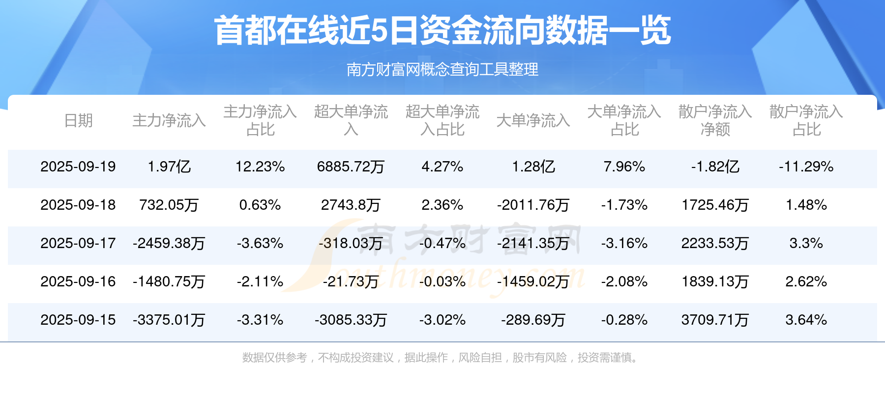 9月19日消息,首都在线主力资金净流入1.97亿元,超大单资金净流入6885.72万元,散户资金净流出1.82亿元。