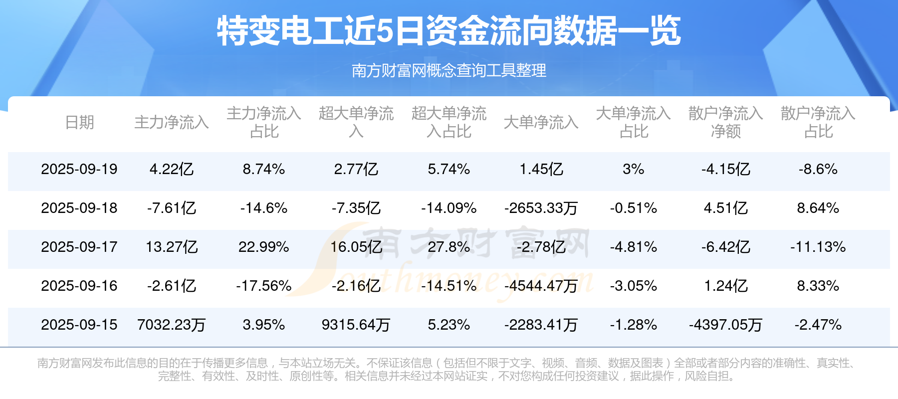 资金流向数据方面,9月19日主力资金净流流入4.22亿元,超大单资金净流入2.77亿元,大单资金净流入1.45亿元,散户资金净流出4.15亿元。