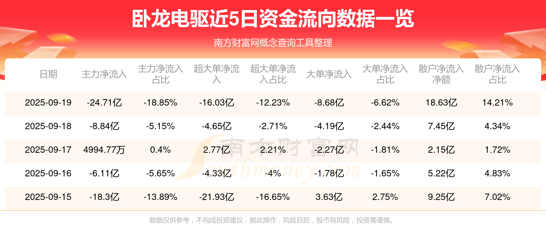 9月19日消息,卧龙电驱资金净流出24.71亿元,超大单资金净流出16.03亿元,换手率16.11%,成交金额131.11亿元。