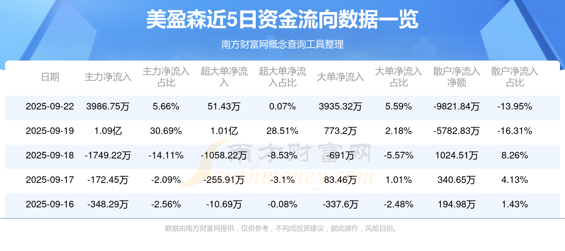 9月22日消息,美盈森9月22日主力资金净流入3986.75万元,超大单资金净流入51.43万元,大单资金净流入3935.32万元,散户资金净流出9821.84万元。