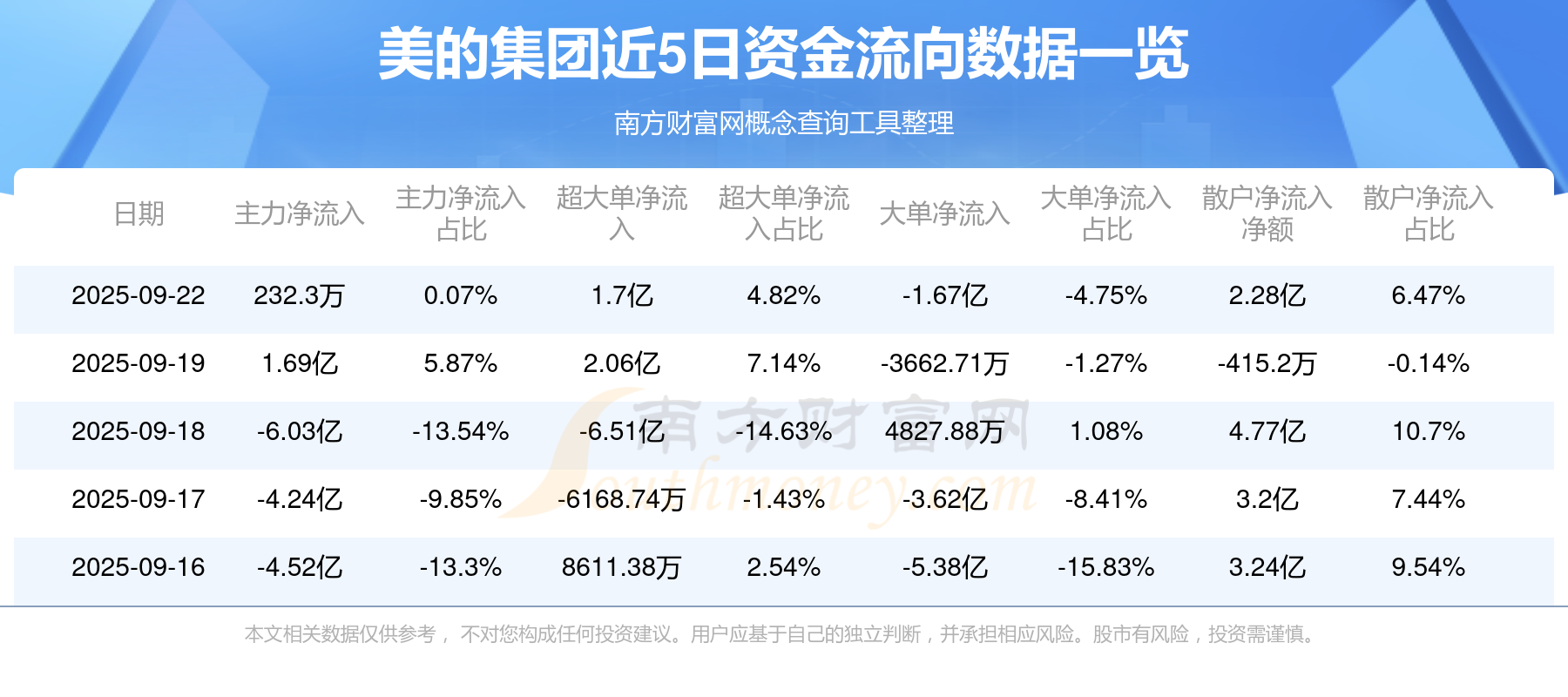 9月22日消息,美的集团9月22日主力资金净流入232.3万元,超大单资金净流入1.7亿元,大单资金净流出1.67亿元,散户资金净流入2.28亿元。
