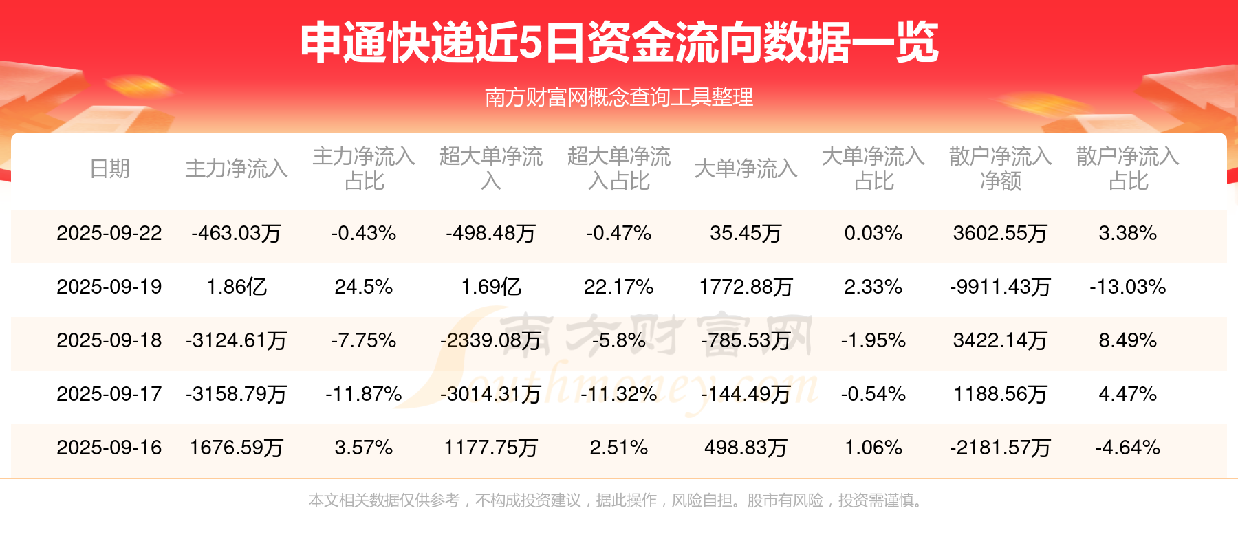 9月22日消息,申通快递9月22日主力净流出463.03万元,超大单净流出498.48万元,大单净流入35.45万元,散户净流入3602.55万元。