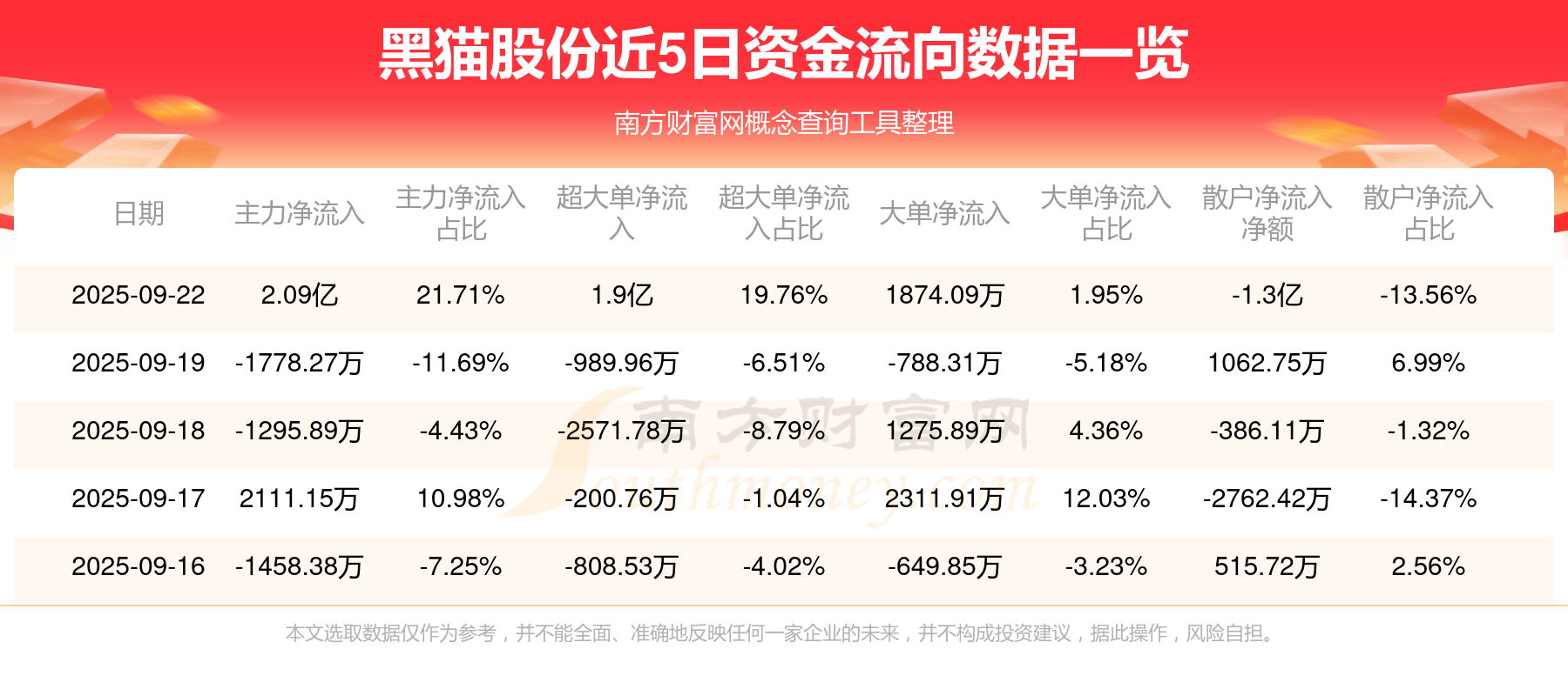 9月22日消息,黑猫股份主力净流入2.09亿元,超大单净流入1.9亿元,散户净流出1.3亿元。