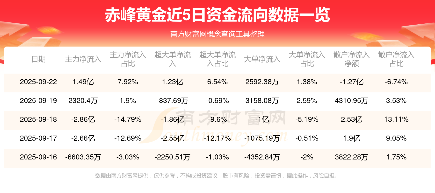9月22日消息,赤峰黄金9月22日主力净流入1.49亿元,超大单净流入1.23亿元,大单净流入2592.38万元,散户净流出1.27亿元。