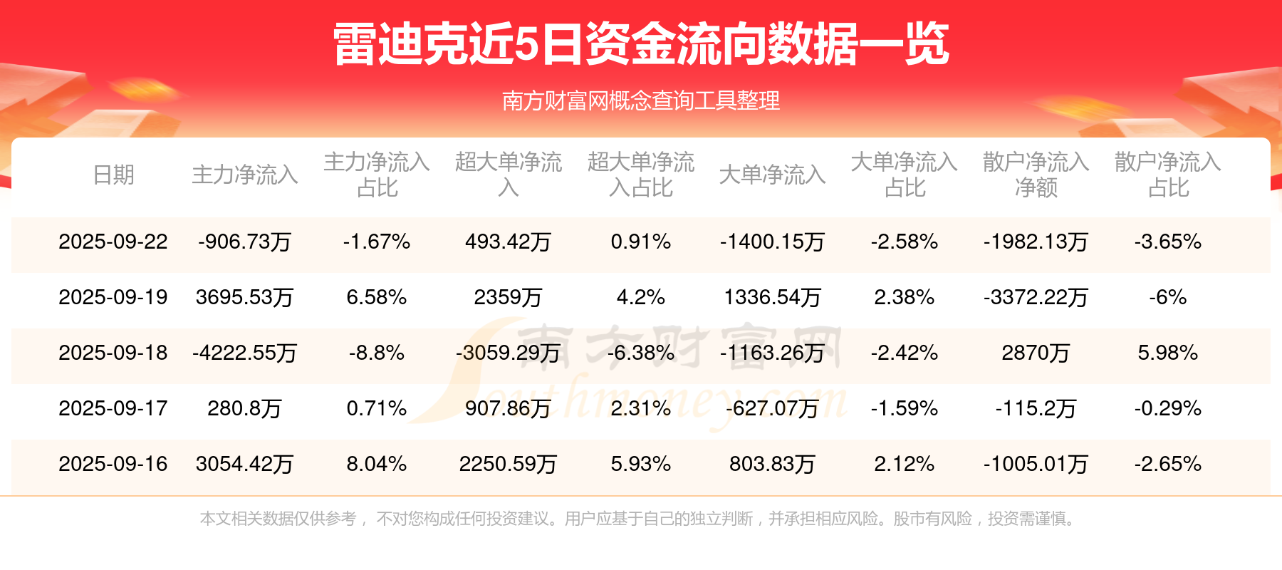9月22日消息,雷迪克主力净流出906.73万元,超大单净流入493.42万元,散户净流出1982.13万元。