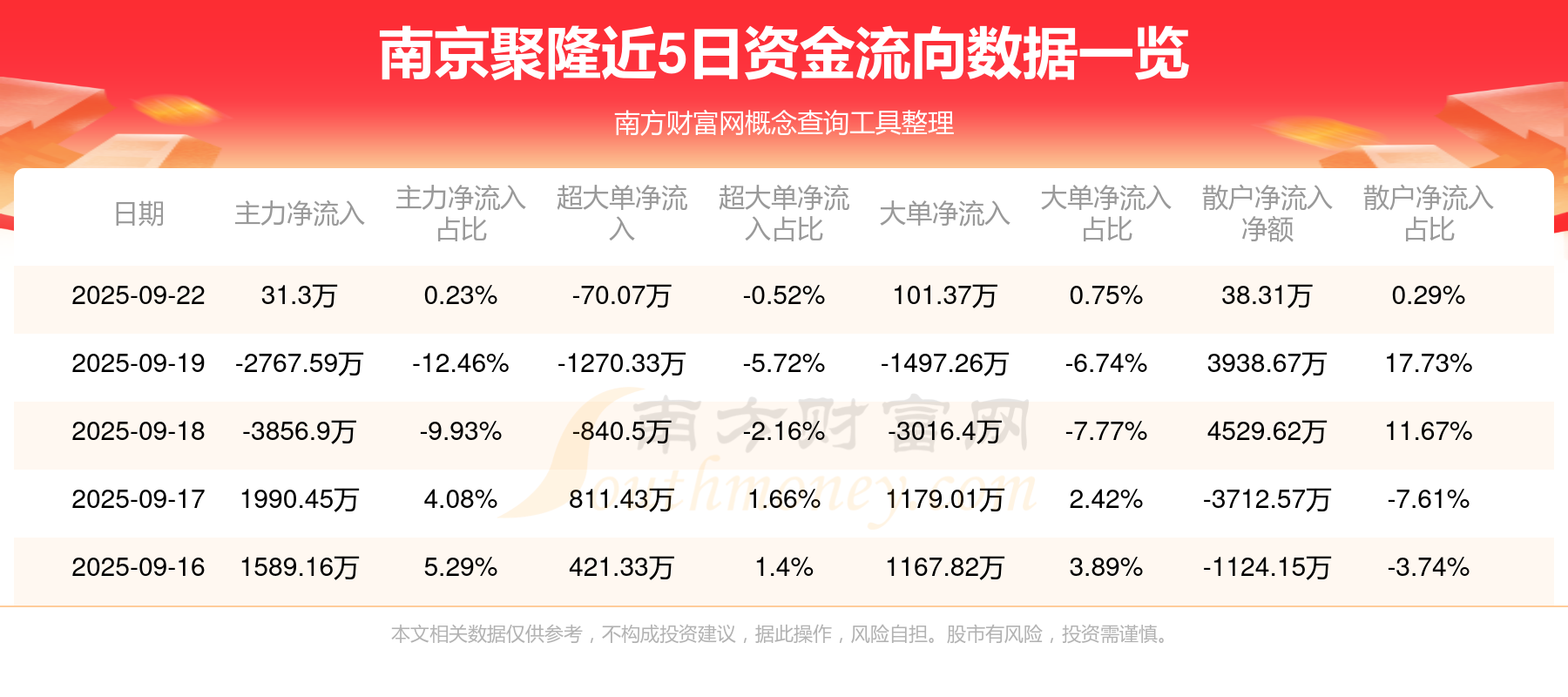 9月22日消息,南京聚隆主力资金净流入31.3万元,超大单资金净流出70.07万元,散户资金净流入38.31万元。