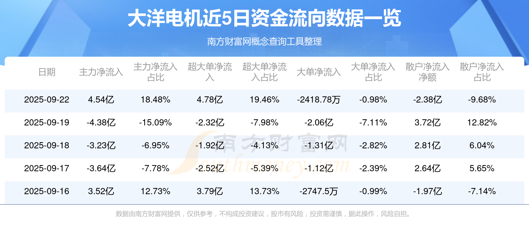9月22日消息,大洋电机主力净流入4.54亿元,超大单净流入4.78亿元,散户净流出2.38亿元。