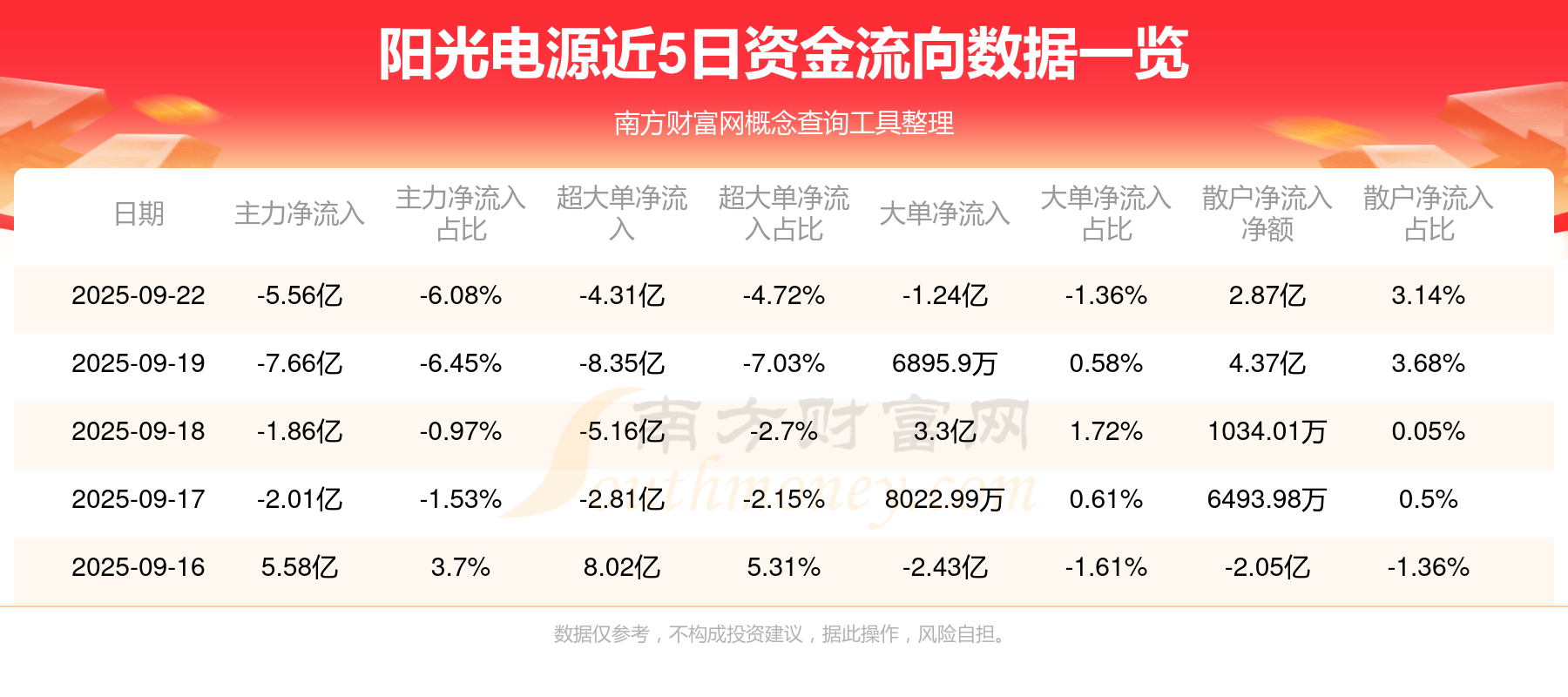9月22日消息,阳光电源主力净流出5.56亿元,超大单净流出4.31亿元,散户净流入2.87亿元。