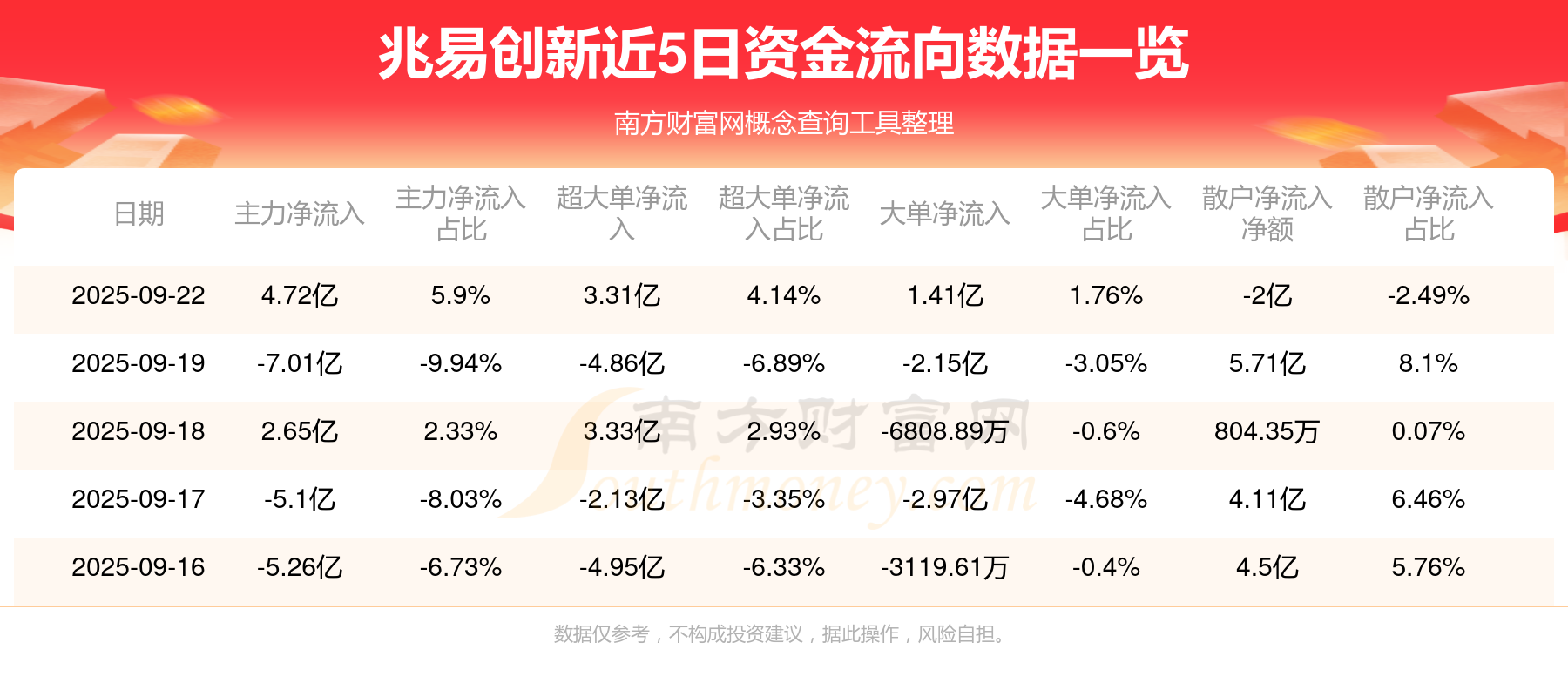 9月22日消息,兆易创新9月22日主力净流入4.72亿元,超大单净流入3.31亿元,大单净流入1.41亿元,散户净流出2亿元。