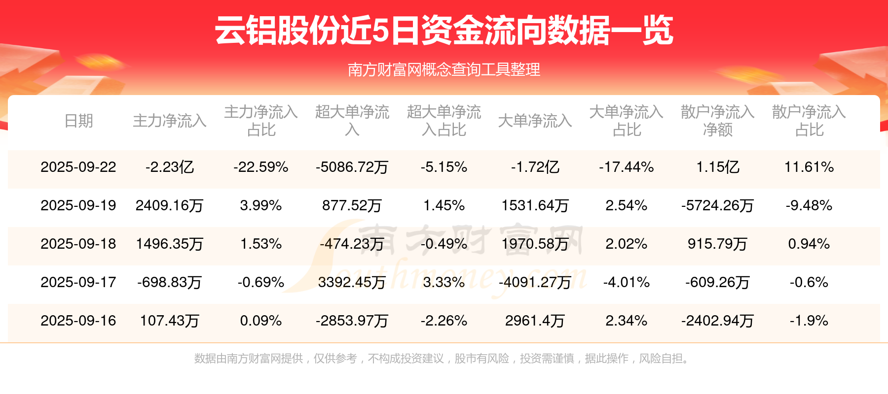 9月22日消息,云铝股份截至15点,该股跌1.79%,报19.700元;5日内股价下跌4.47%,市值为683.19亿元。