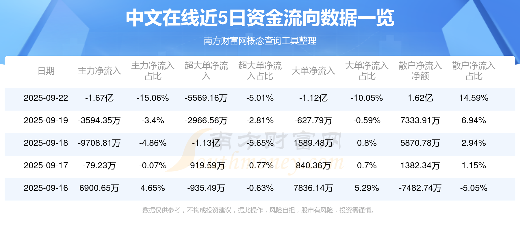 9月22日消息,中文在线9月22日主力资金净流出1.67亿元,超大单资金净流出5569.16万元,大单资金净流出1.12亿元,散户资金净流入1.62亿元。