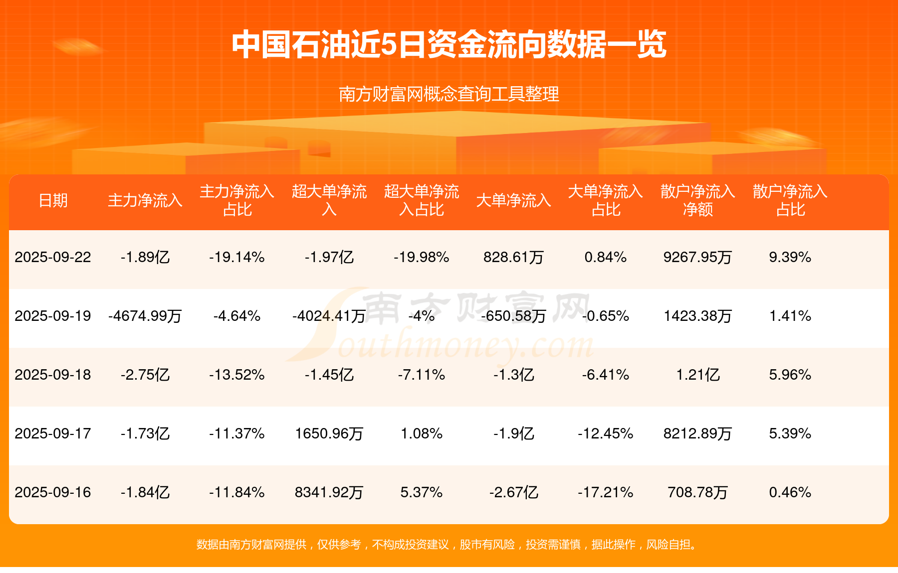 9月22日消息,中国石油主力净流出1.89亿元,超大单净流出1.97亿元,散户净流入9267.95万元。