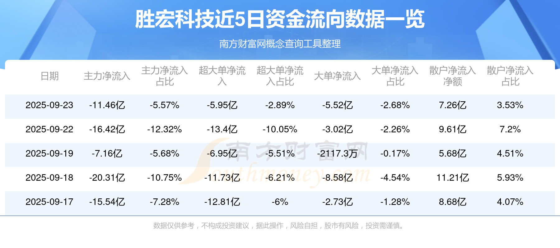 9月23日消息,胜宏科技9月23日主力资金净流出11.46亿元,超大单资金净流出5.95亿元,大单资金净流出5.52亿元,散户资金净流入7.26亿元。