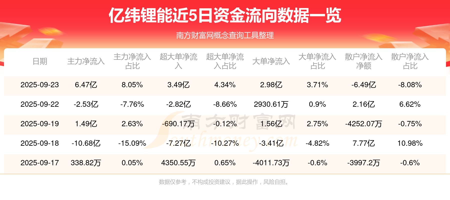 9月23日消息,亿纬锂能9月23日主力资金净流入6.47亿元,超大单资金净流入3.49亿元,大单资金净流入2.98亿元,散户资金净流出6.49亿元。
