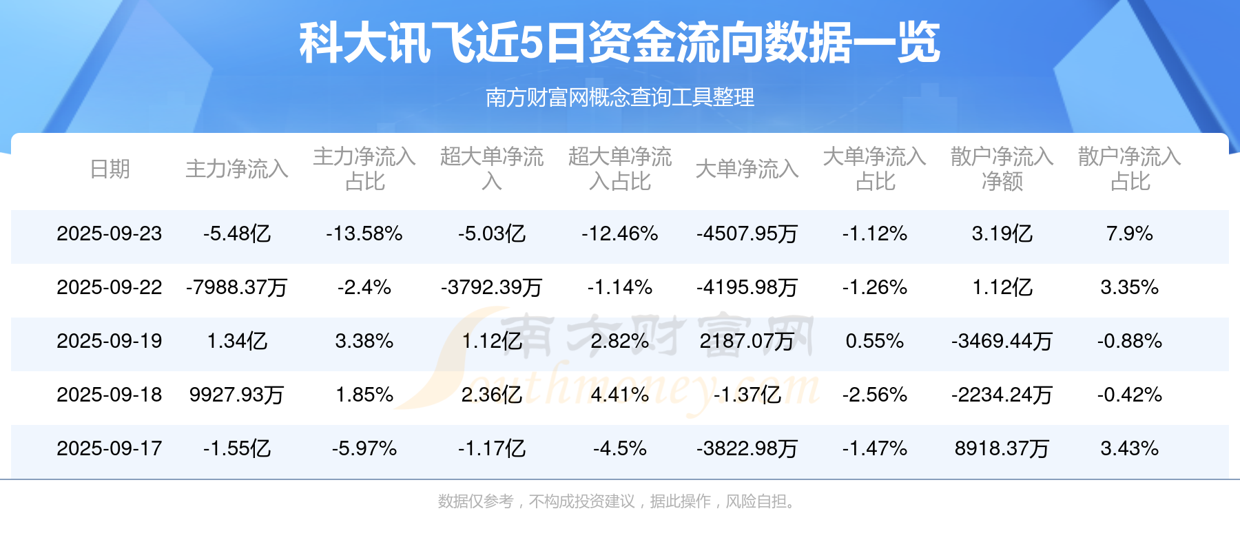 9月23日消息,科大讯飞主力资金净流出5.48亿元,超大单资金净流出5.03亿元,散户资金净流入3.19亿元。