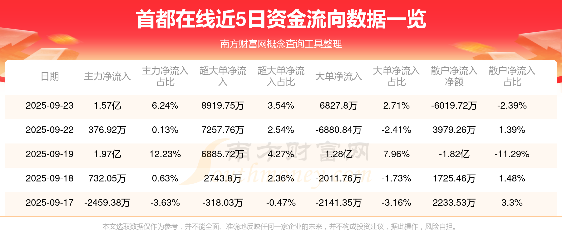 9月23日消息,首都在线主力资金净流入1.57亿元,超大单资金净流入8919.75万元,散户资金净流出6019.72万元。