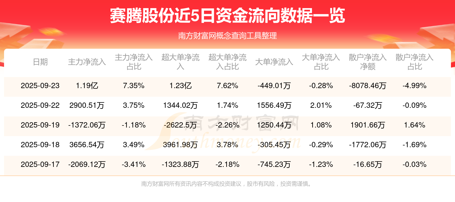 9月23日该股主力资金净流入1.19亿元,超大单资金净流入1.23亿元,大单资金净流出449.01万元,中单资金净流出3802.17万元,散户资金净流出8078.46万元。