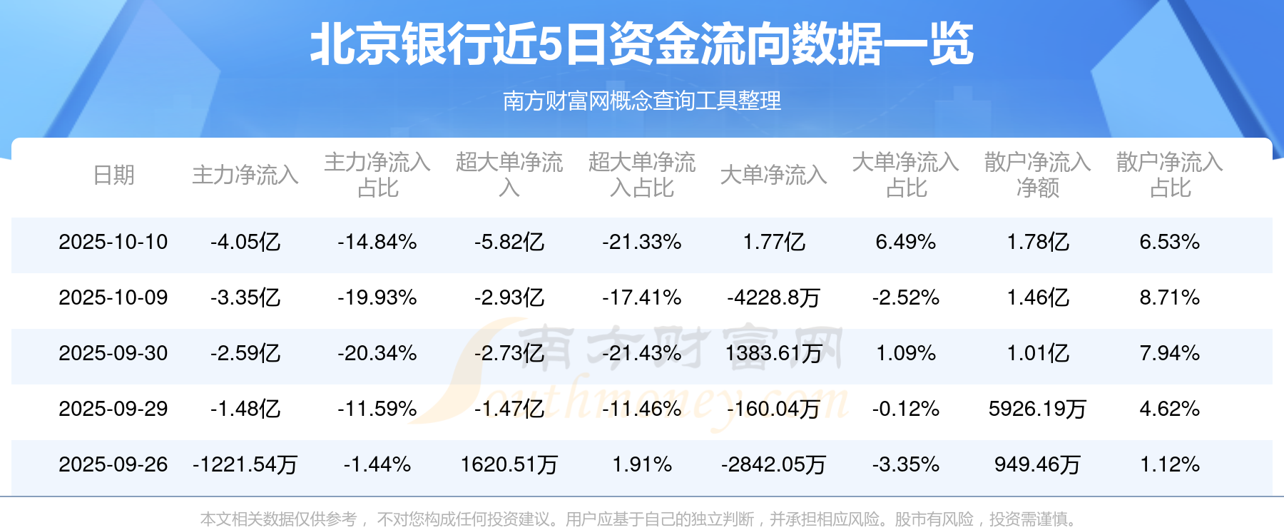 10月10日消息,北京银行10月10日主力净流出4.05亿元,超大单净流出5.82亿元,大单净流入1.77亿元,散户净流入1.78亿元。