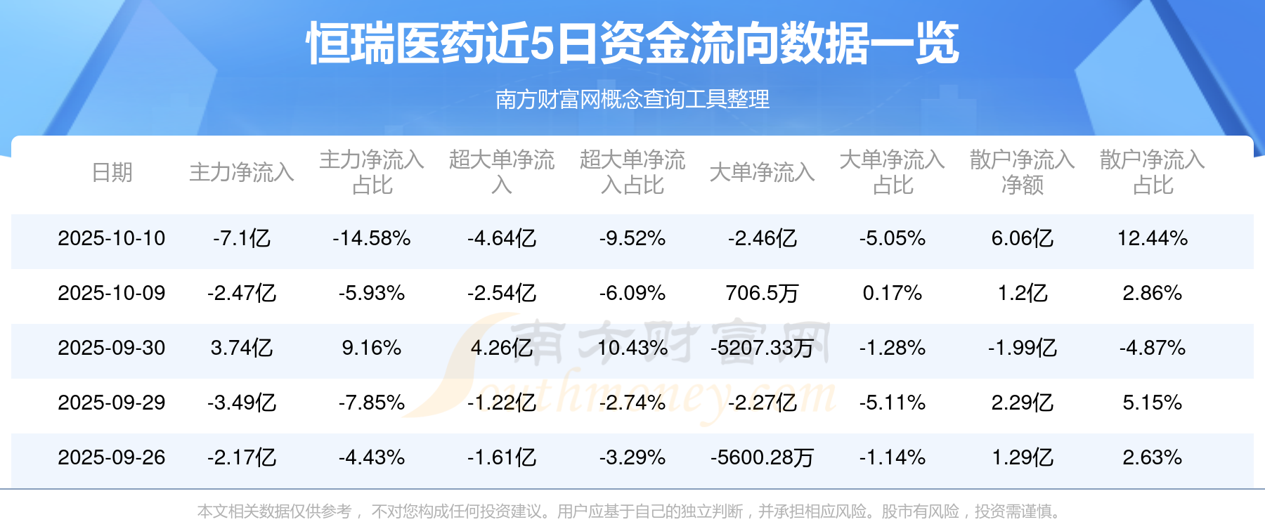 10月10日消息,恒瑞医药主力资金净流出7.1亿元,超大单资金净流出4.64亿元,散户资金净流入6.06亿元。