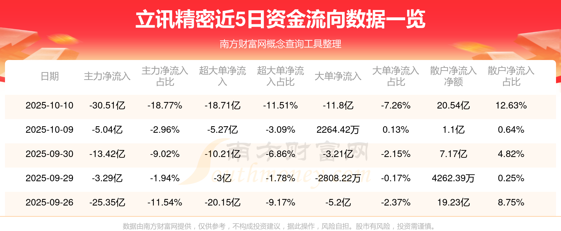 10月10日消息,立讯精密主力资金净流出30.51亿元,超大单资金净流出18.71亿元,散户资金净流入20.54亿元。