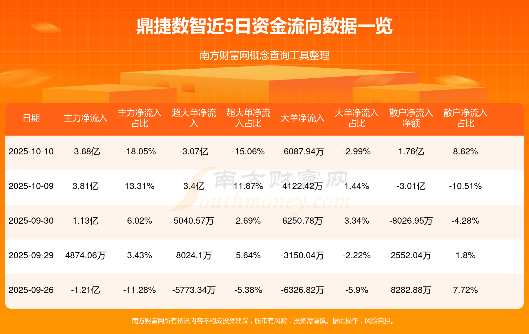 10月10日消息,鼎捷数智主力净流出3.68亿元,超大单净流出3.07亿元,散户净流入1.76亿元。
