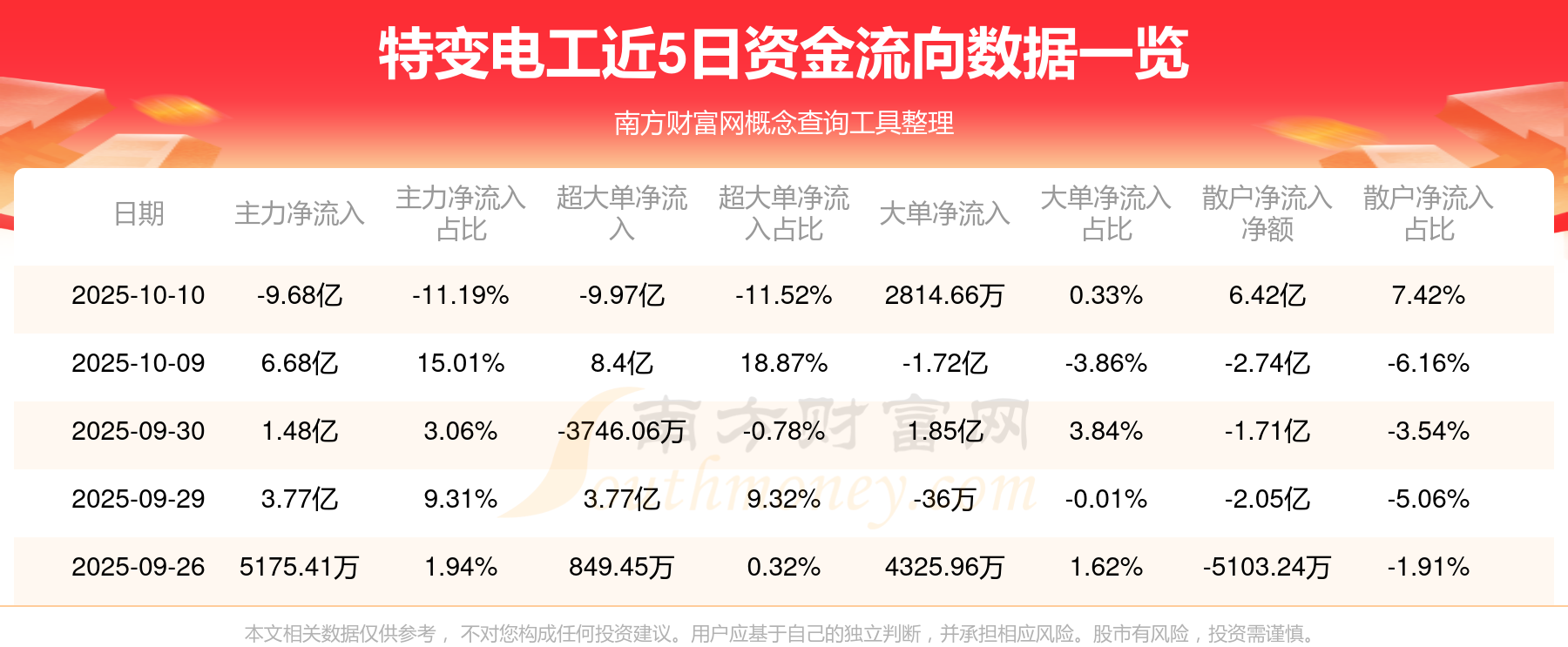10月10日消息,特变电工主力净流出9.68亿元,超大单净流出9.97亿元,散户净流入6.42亿元。