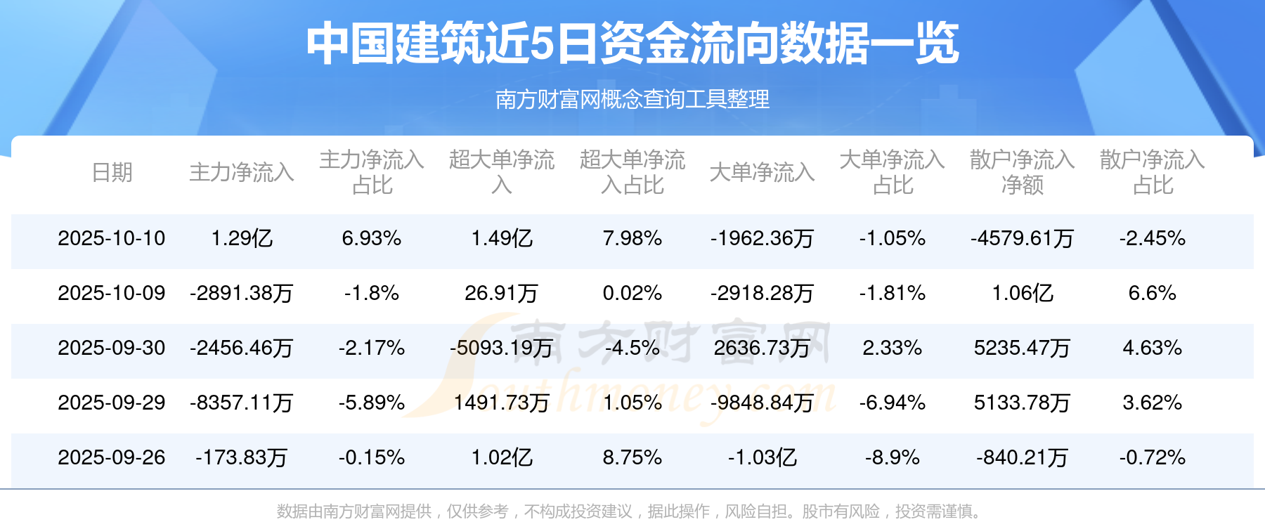 10月10日消息,中国建筑10月10日主力净流入1.29亿元,超大单净流入1.49亿元,大单净流出1962.36万元,散户净流出4579.61万元。