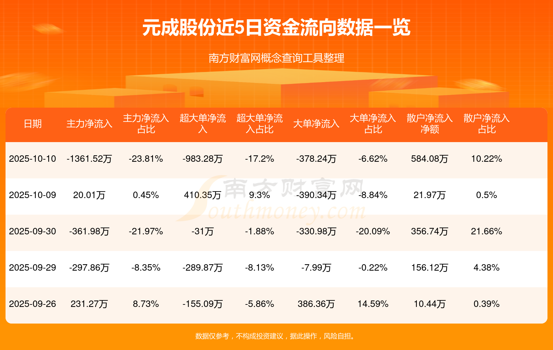10月10日消息,元成股份10月10日主力资金净流出1361.52万元,超大单资金净流出983.28万元,大单资金净流出378.24万元,散户资金净流入584.08万元。