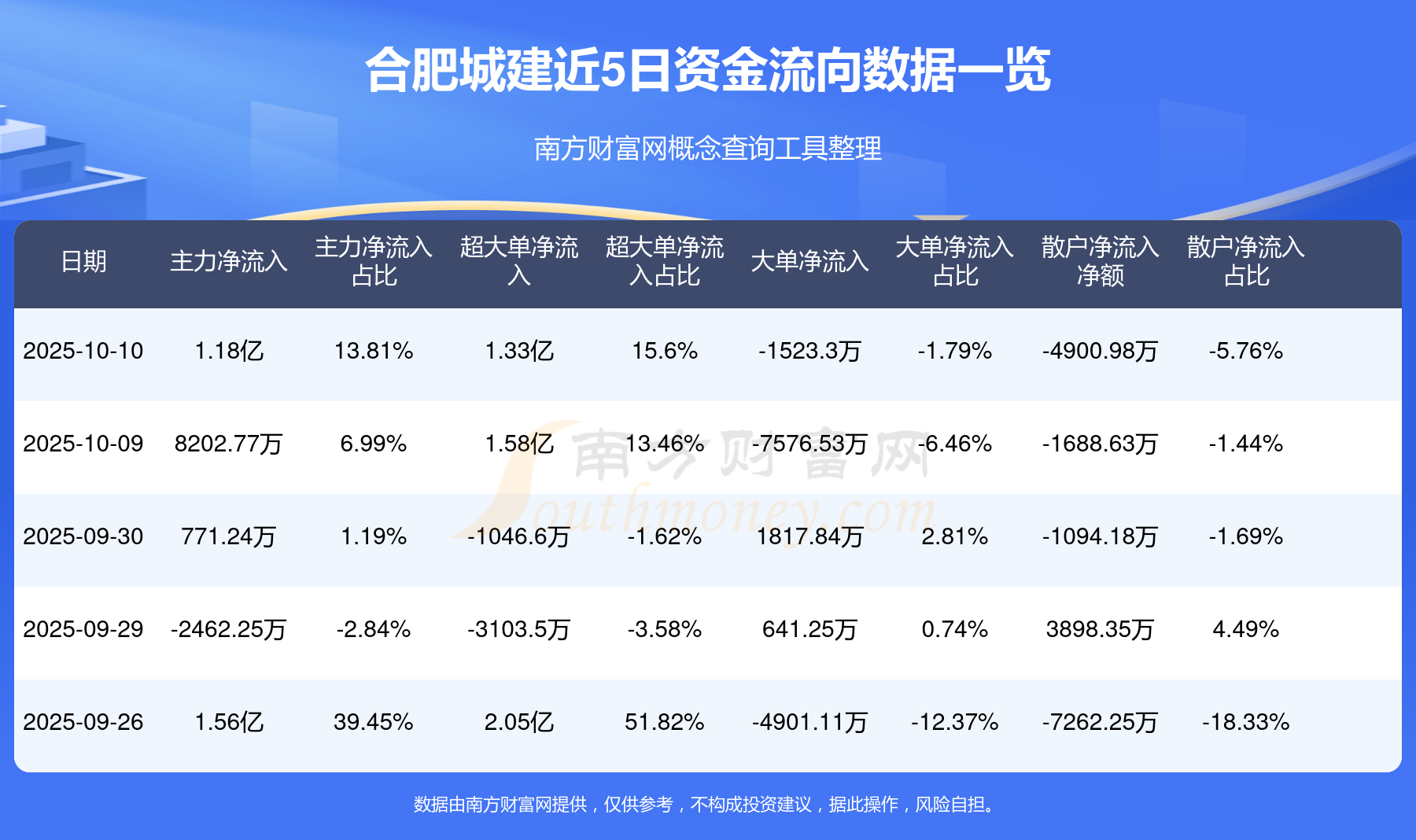10月10日消息,合肥城建主力净流入1.18亿元,超大单净流入1.33亿元,散户净流出4900.98万元。