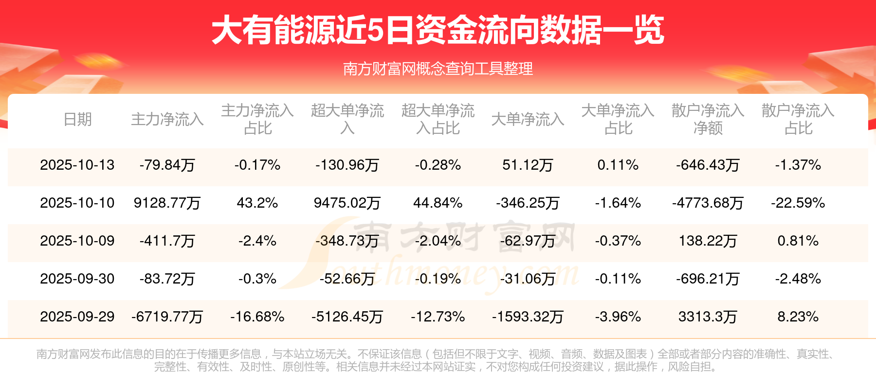 10月13日消息,大有能源10月13日主力净流出79.84万元,超大单净流出130.96万元,大单净流入51.12万元,散户净流出646.43万元。