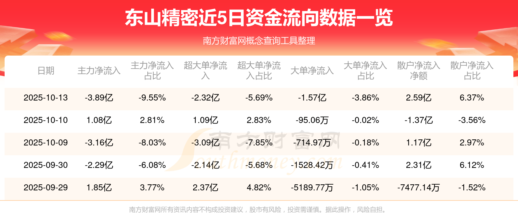 10月13日消息,东山精密主力净流出3.89亿元,超大单净流出2.32亿元,散户净流入2.59亿元。