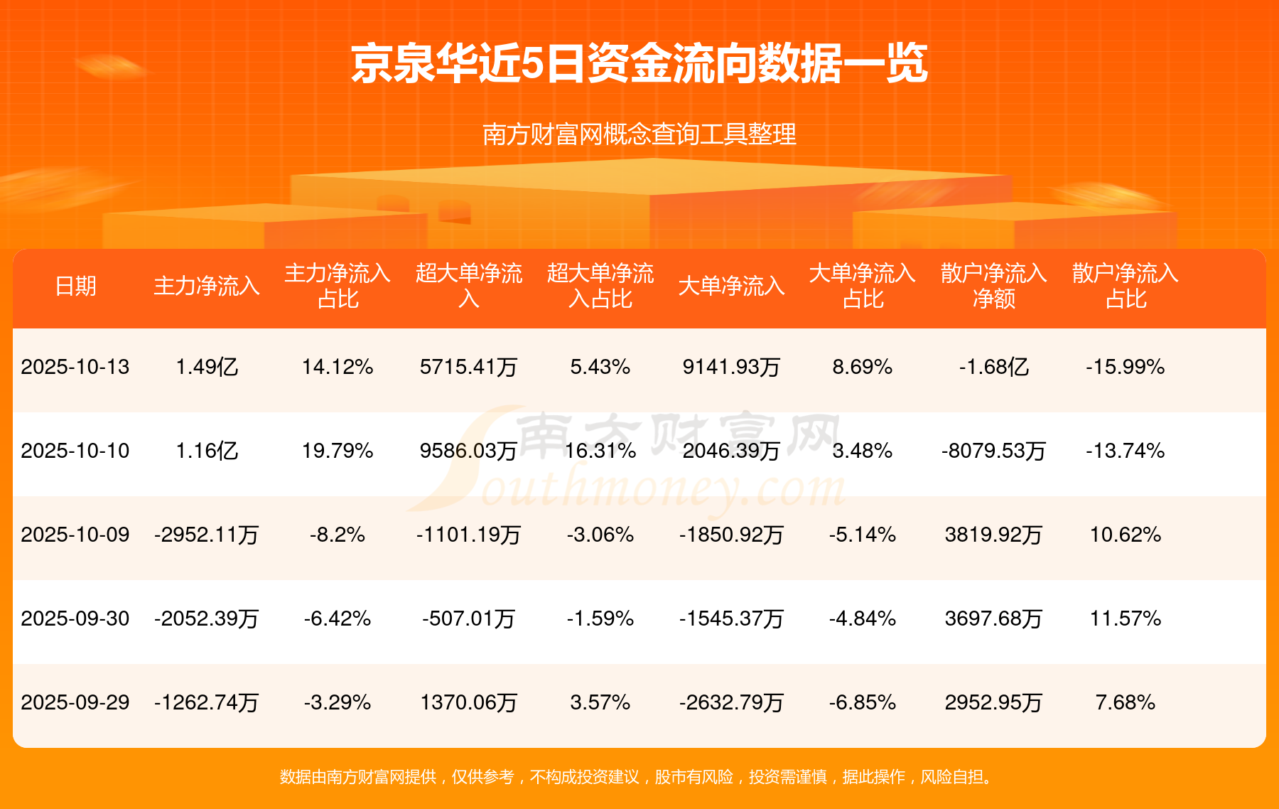 10月13日消息,京泉华10月13日主力资金净流入1.49亿元,超大单资金净流入5715.41万元,大单资金净流入9141.93万元,散户资金净流出1.68亿元。