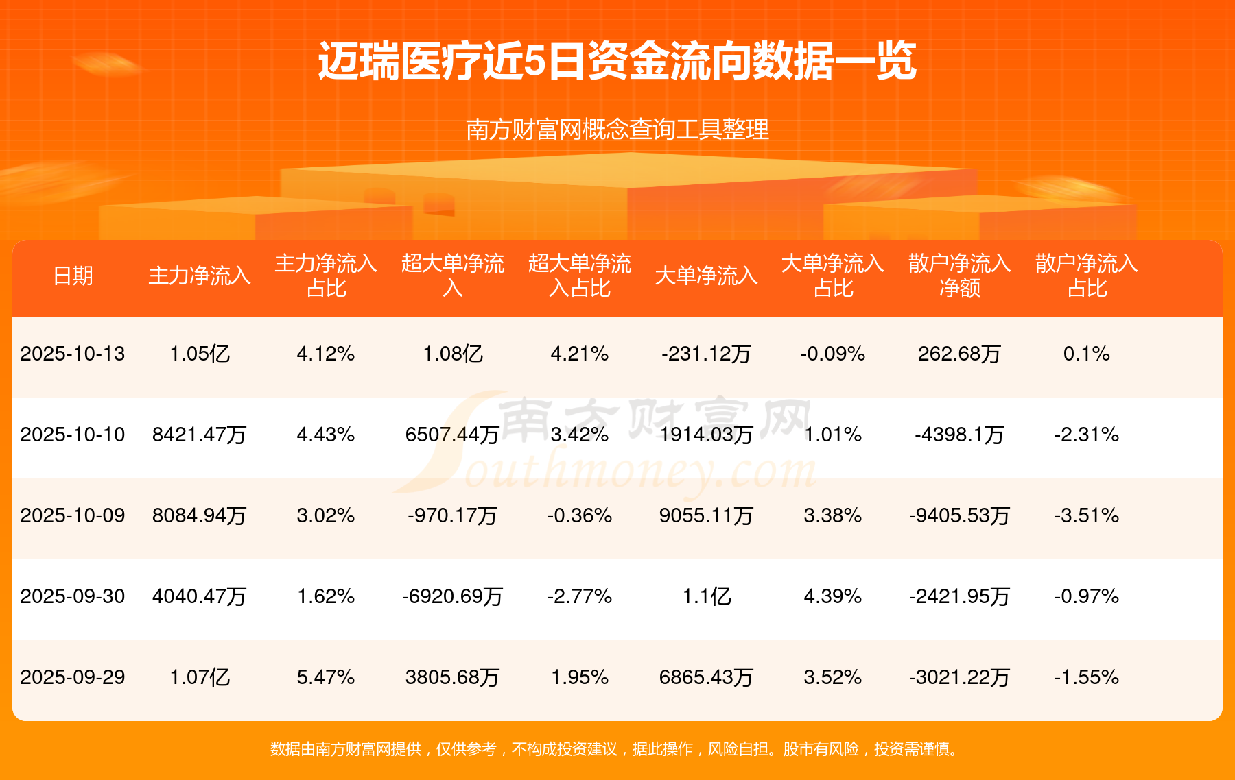 10月13日消息,迈瑞医疗主力净流入1.05亿元,超大单净流入1.08亿元,散户净流入262.68万元。