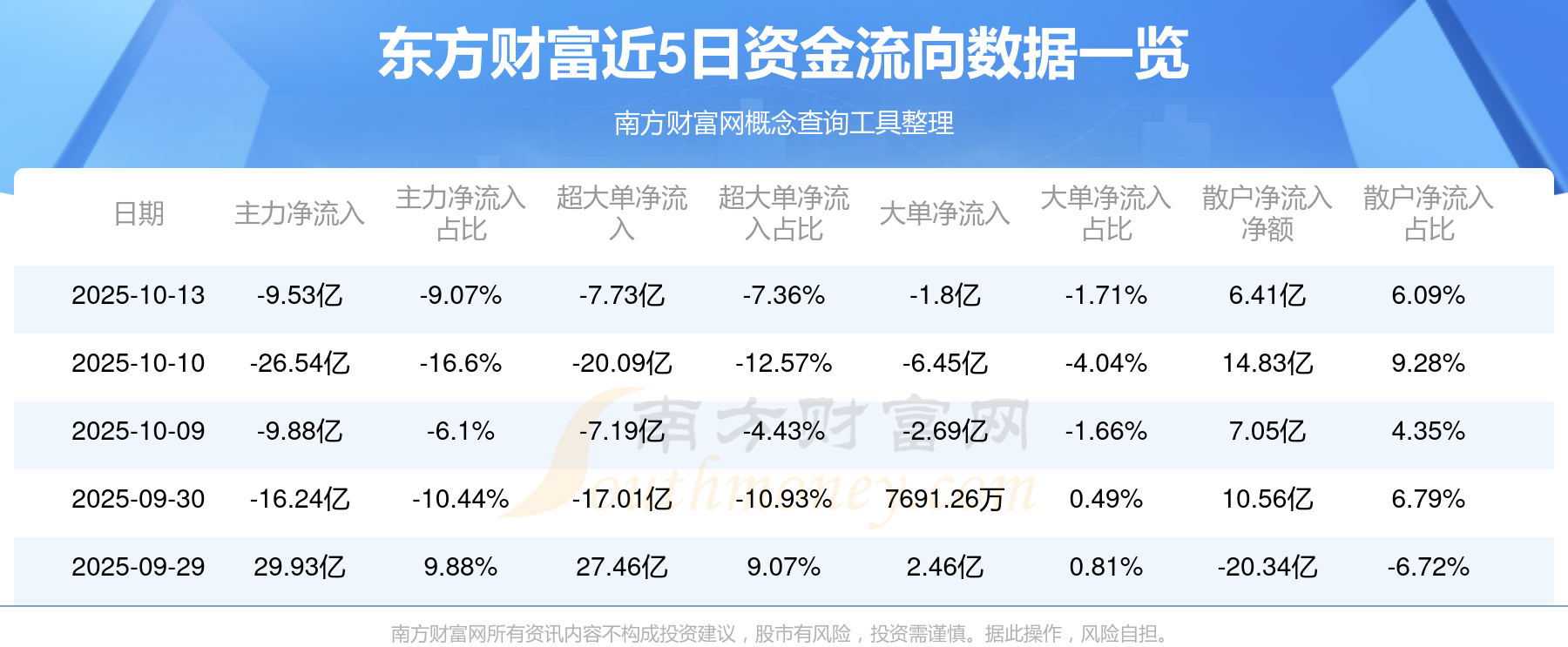 10月13日收盘消息,东方财富(300059)跌1.61%,报25.620元,成交额105.13亿元。