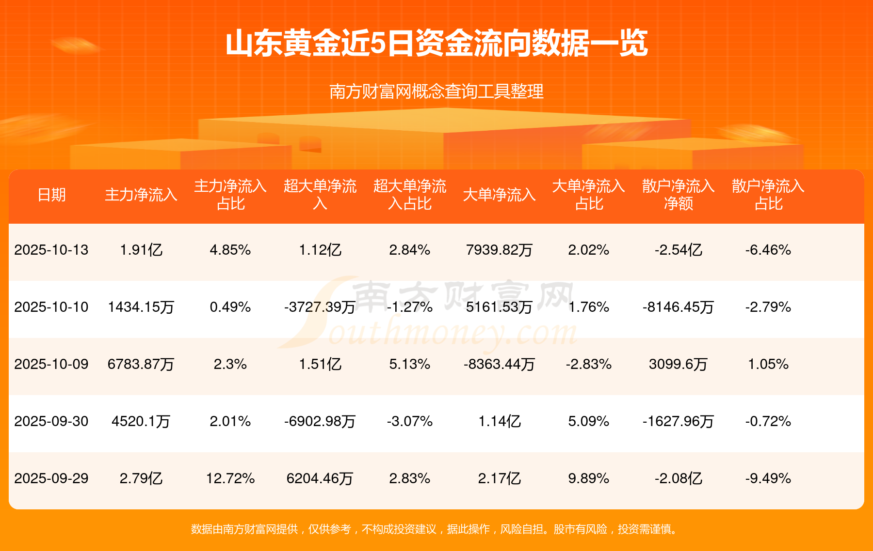 10月13日消息,山东黄金主力资金净流入1.91亿元,超大单资金净流入1.12亿元,散户资金净流出2.54亿元。