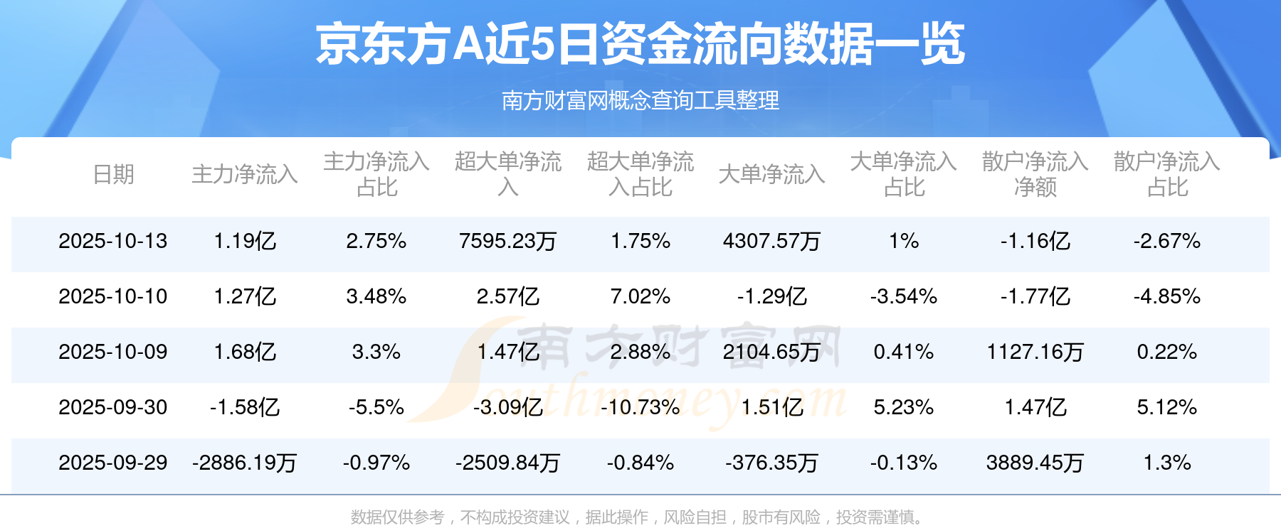 10月13日消息,京东方A主力资金净流入1.19亿元,超大单资金净流入7595.23万元,散户资金净流出1.16亿元。
